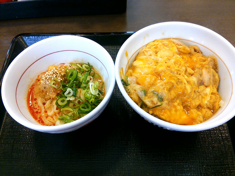 今回は、定番の親子丼に、小冷やし担々うどんをセットにしてみました。
