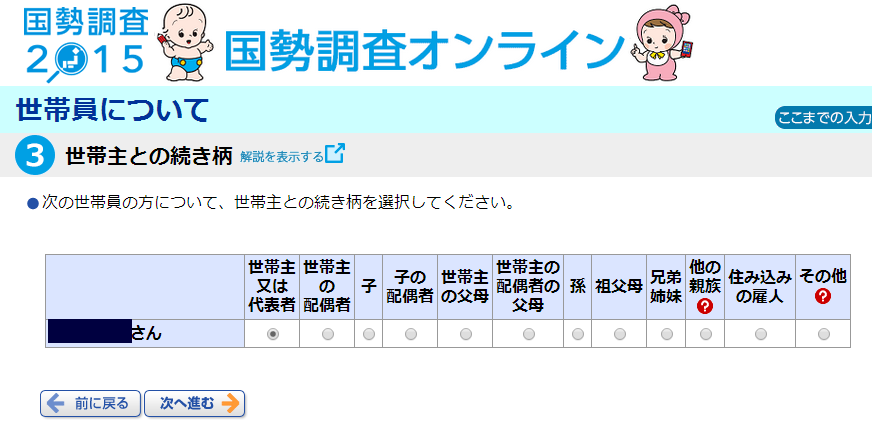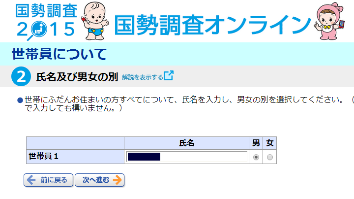 世帯員毎に名前と、男女の別を入力します。ここら辺は、ずっと継承されてきた内容なのでしょうが、これからは男女で分ける事に異議がある人も出てくるでしょうね。