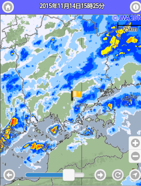 そうこうしているうちに雨脚が強まってきました。その後、いったん弱まったものの、試合中にはかなりの大雨となっていました。丁度、一時的に岡山市の辺りを雨雲が避けるように通っていたようですが、その後は雨の強いエリアに入っていたようです。