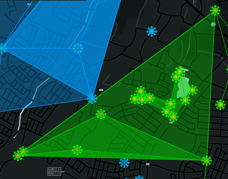 「船橋市総合体育館」から「安養寺」、「坪井きりかぶ公園」を結ぶ3点で作成しました。この3点自体は、いづれも味方ポータルだったので、途中邪魔になる敵リンクを切るのが主な作業となりました。