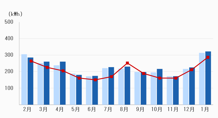 うちの場合は、1月の使用量が最も多く、300kWhを越えてきます。その他の月は上下差はありますが、200kWh~300kWhに収まっている感じです。