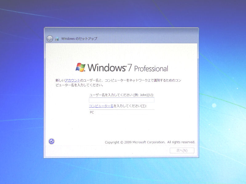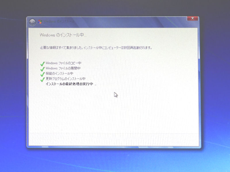 メモリーを4GBにしたところで、Windows7のインストールを開始しました。