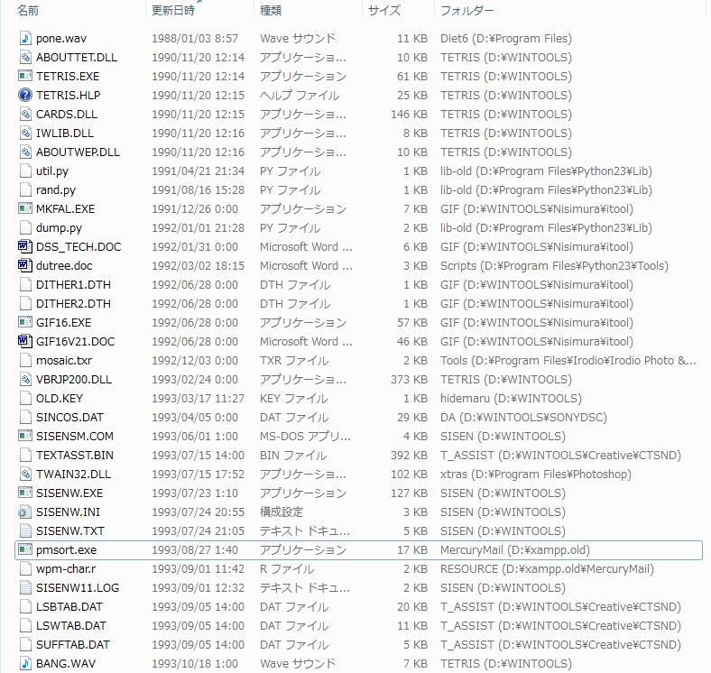 今のPC上に保存されているタイムスタンプが古い物順で検索したら、こんな結果になりました。なんかしらのソフトに含まれているファイルがほとんどという結果になりました。古いファイルがそのまま使われていたのか、タイムスタンプが古いだけなのかはわかりませんが、これといったものはないですね。