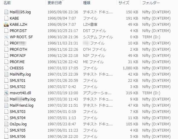 ちょっと目線を代えて、特定フォルダーだけで探してみました。一番古いファイルは会社のメールをテキストで残しておいたものでした。その他、1996年代のNiftyServeのログが出てきました。まだ、この頃はパソコン通信をやっていたんですよね。
