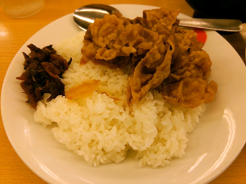 という事で、カレーどっさりとかけちゃいました。いや、これ何気に難しい。あふれちゃいます。こうやって見ると、松屋のカレーギュウは意外と量が多いですね。すき家なんかだと、カレーの下にご飯がなかったりしますから。