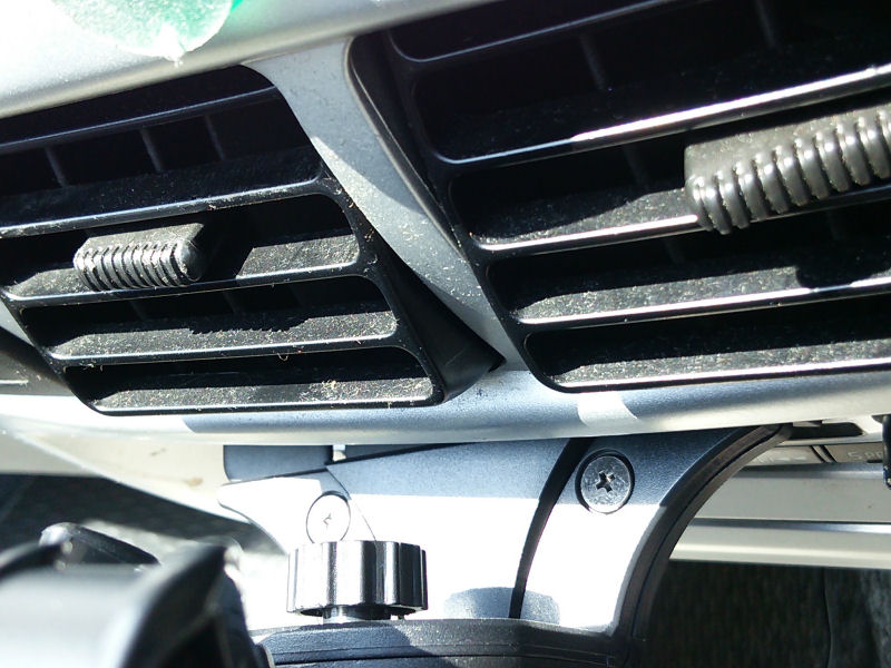 すいません、そうじしてないのでエアコン口が汚いですが。CDスロットに差し込んで、下についているネジを締め上げると羽が反ってきて固定されます。