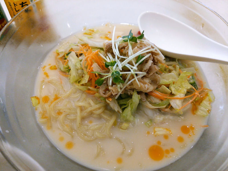 ひやしちゃんぽんの白は、白湯スープになっていますが、味つけ的にはかなりさっぱりしてます。野菜たっぷりちゃんぽんについている、生姜ドレッシングと、柚子胡椒ドレッシングが付いてきています。