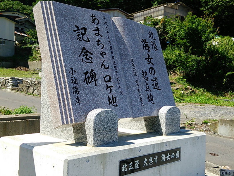 さらに、真新しい本型の記念碑がありました。"北限 海女の道起点地"と"あまちゃん ロケ地 記念碑"が対になっています。Googleストリートビューで観ると、2014年にはなかったので、かなり新しいもののようです。