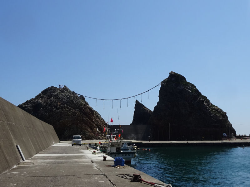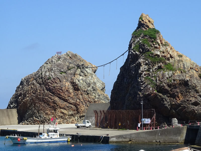 堤防の入り口にあるのが夫婦岩と呼ばれる大きな岩です。ここに張られているしめ縄は、東日本大震災時の大津波でも切れなかったという事で、縁起物とされているそうです。