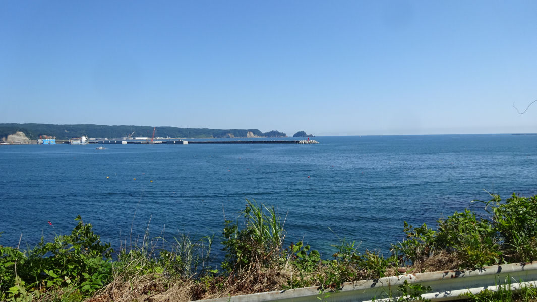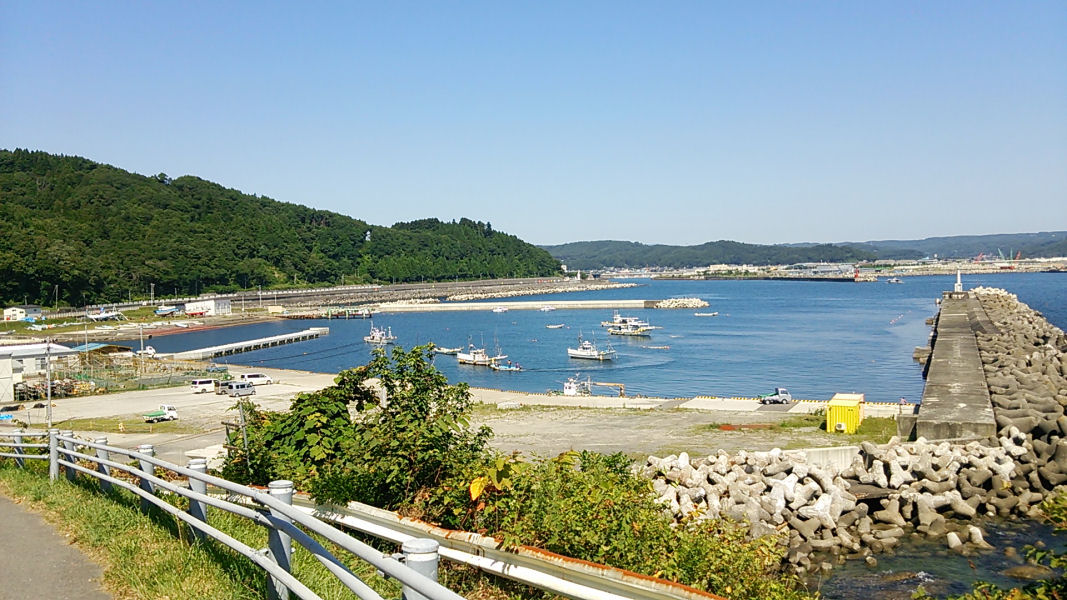 同じ場所から、海の方を観た風景になります。向かい側にも港が見えますが、この辺一帯が久慈湾になっています。