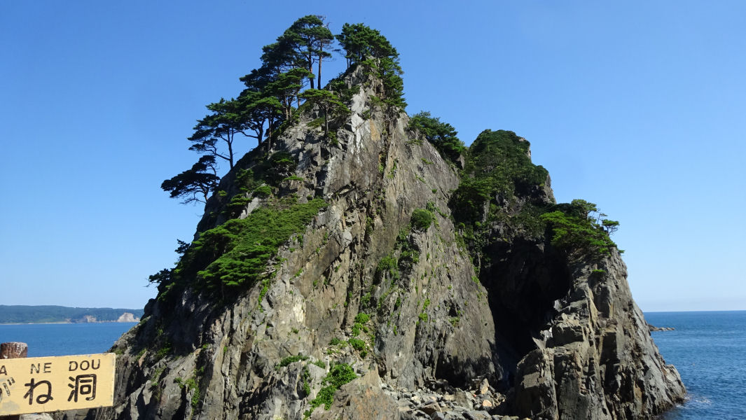 さらに先まで行くと、途中で見えるのが"つりがね洞"になります。明治三陸地震の前までは、洞穴の中に釣り鐘型の岩があったそうです。