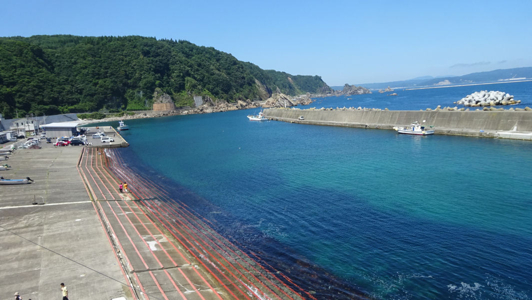 屋上までいくと展望台になっていて、小袖漁港を一望する事ができます。先程も、見てきた小袖漁港でしたが、上から観ると海のいろが非常にキレイなのがわかります。