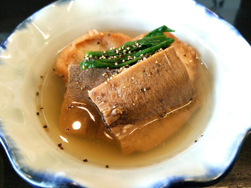 ゆでたんになります。やわらかく煮込んだ牛たんと、仙台名物の油麩の煮物になっています。牛たんが柔らかくておいしい。