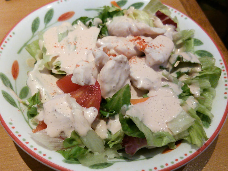 パスタの前に、まずはサラダ。やわらかチキンのサラダです。これは、以前はなかったメニューですね。チキンのサラダは欲しかったので、これはいいですね。