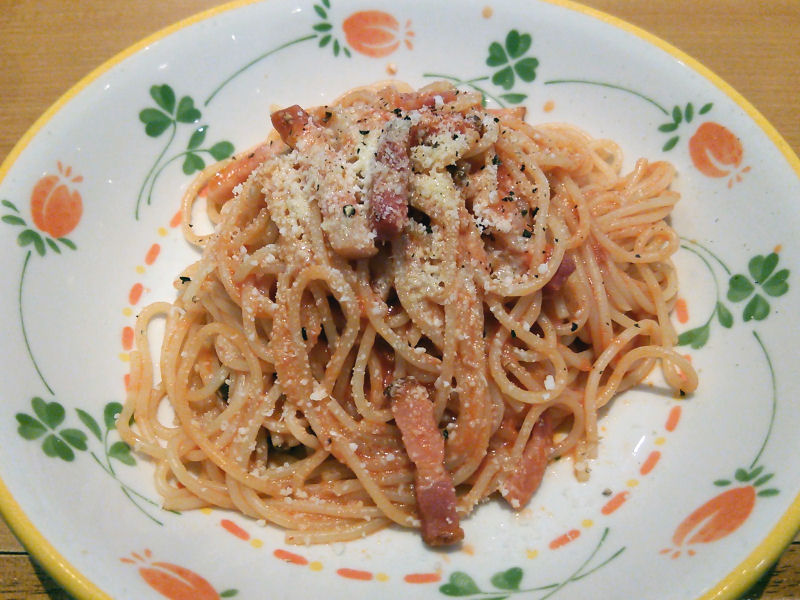今回は、アマトリチャーナ ロッソを注文してみました。見たとおりのシンプルなパスタになっています。チーズがたっぷりとのってます。