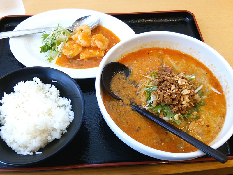ランチメニューでは、麺類と一品料理のセットがあります。担々麺とのセットでは、エビチリ、回鍋肉、油淋鶏、麻婆豆腐の中から1品とごはんがついたセットになります。今回は、その中からエビチリを選択しました。