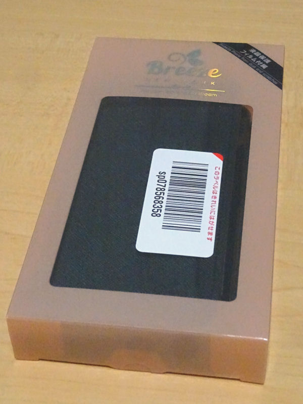 Breeze手帳ケースのブラックにしました。ケースの外箱は、こんな感じ。ケースの他に、液晶保護フィルムも付属してますが、既に装着済みなので不要です。