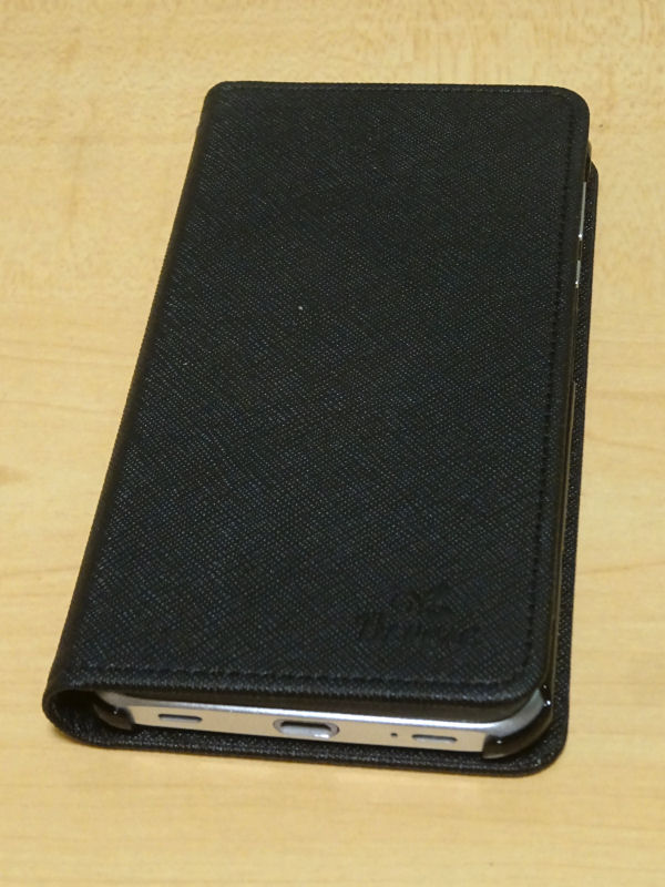 手帳ケースを閉じたところです。カラーバリエーションはあったのですが、やはり黒が落ち着きます。吸盤で装着しているだけなので、たまに外れてしまう事もありますが、特に困ることはありません。