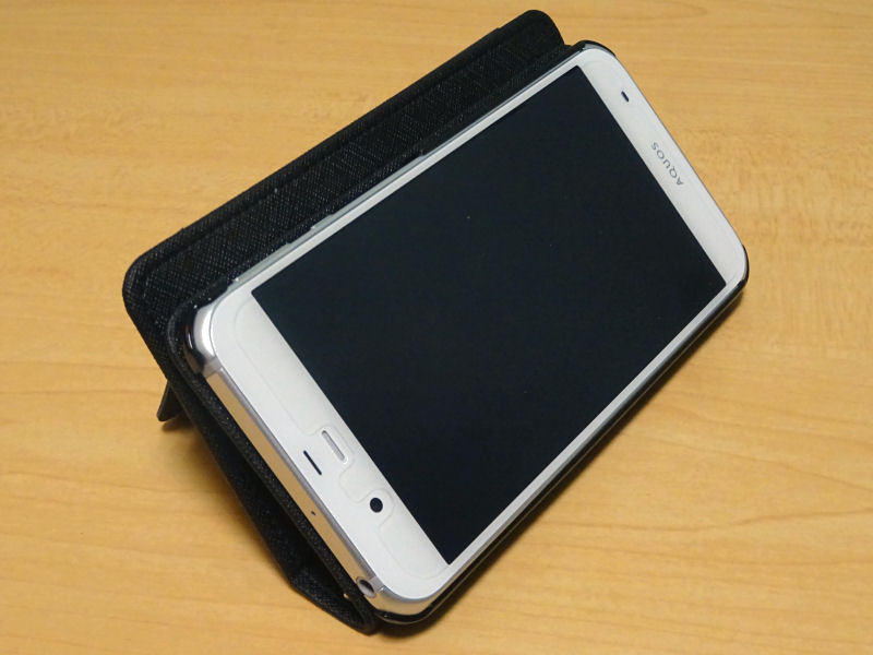 この手帳型ケースは、横置きでスタンドとしても仕えるようになっています。テレビなどを視聴するときには、こうした感じで置いて見る事ができます。