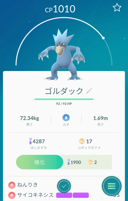 これはコダックから進化させたゴルダック。いままでジムで見かけた事はあったんですが、ようやく登録でしました。