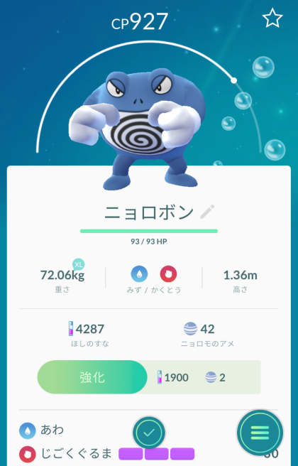 これも進化させたニョロボン。アメが割と手に入りやすかったので、進化させやすかったのです。