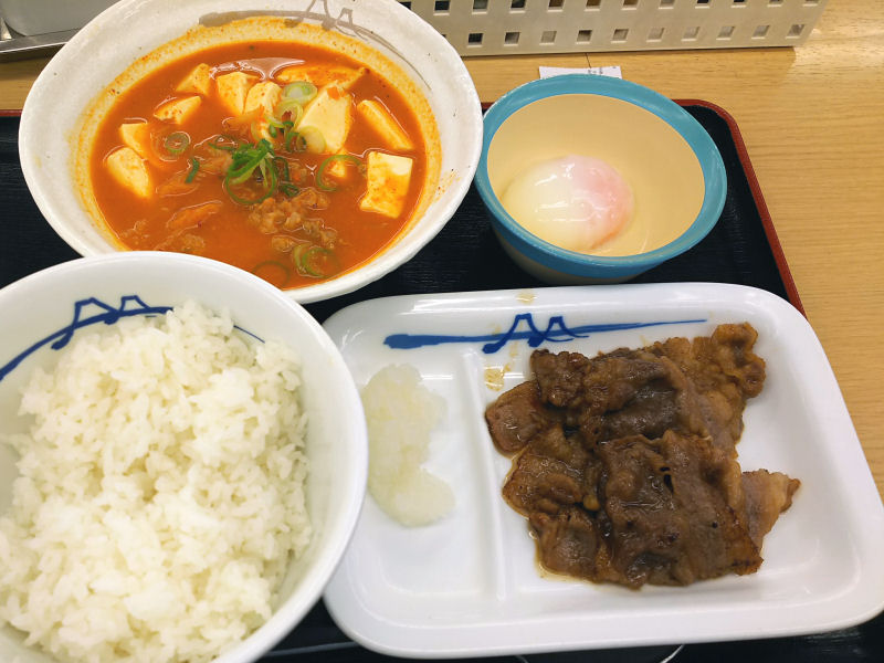 豆腐キムチチゲには、温玉を投入。玉子と崩すとまろやかな味わいになります。豆腐、キムチ、牛肉と松屋にある具材ですが、このスープが美味しい。やや、味付けが濃いめなのでご飯といっしょでもいけます。