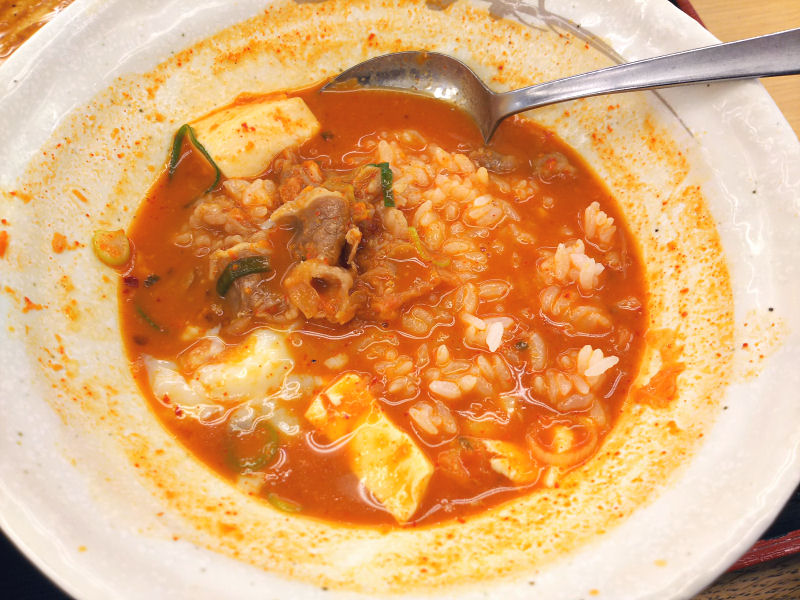 という事で、ごはんを少し残して投入。キムチクッパで締めました。辛そうに見えるが、見た目ほどは辛くありません。