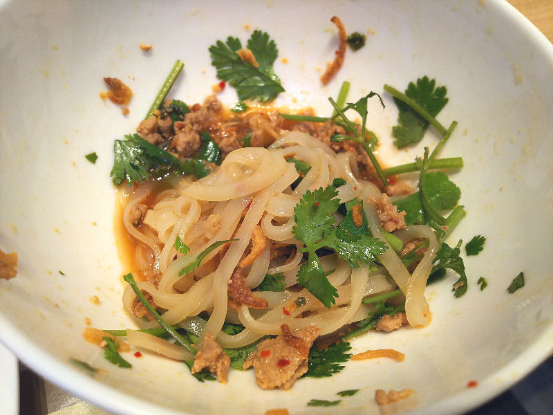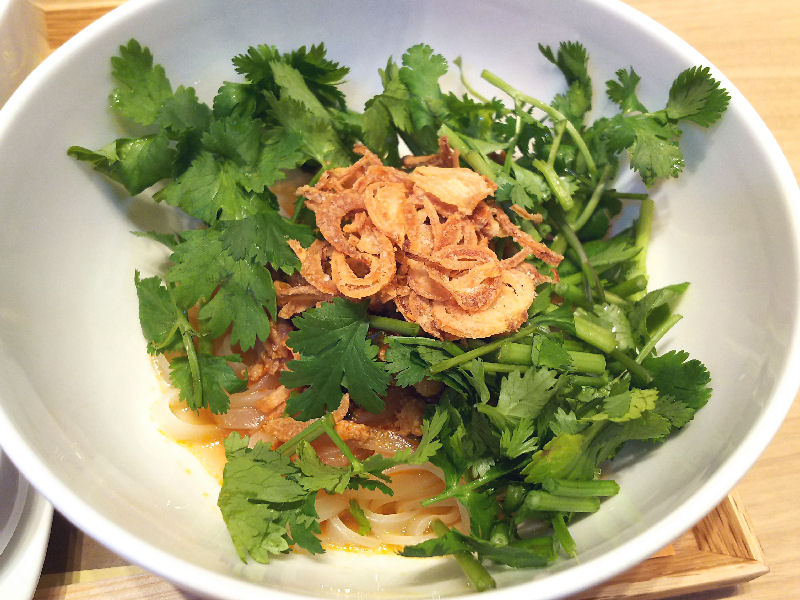 パクチーまぜフォー。名前のとおりに、パクチーがたっぷりとはいったまぜ麺になっています。具材はひき肉などがはいっていました。