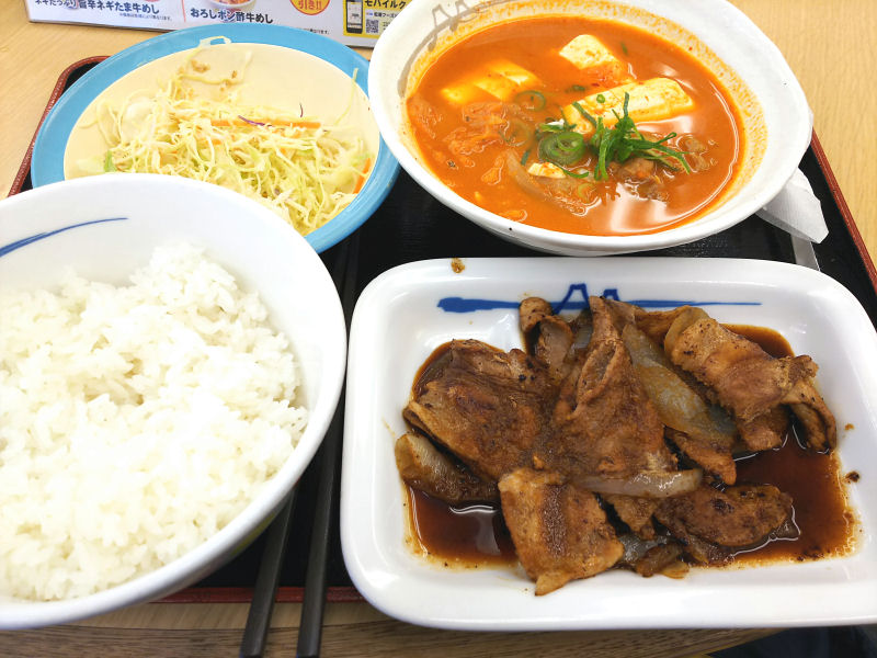 松屋の豚バラ生姜焼き定食 ちょっと焦げすぎ