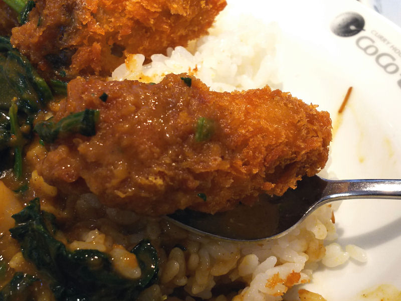 カキフライをアップで。ココイチは、揚げ物が意外と美味しいのがいいです。