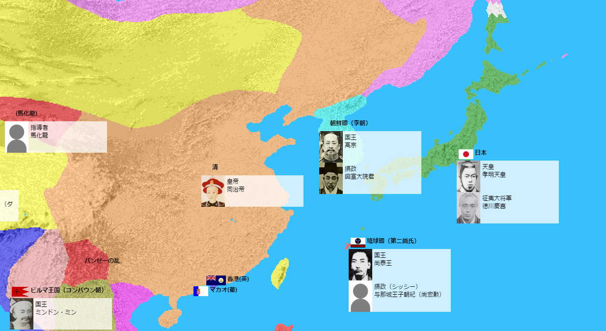 さらに時代は進んで、1867年。この翌年が明治元年に当たります。幕末の時代という事になります。当時の中国は清となっています。清の建国は1616年という事は大坂の陣の翌年という事になるので、そうとう長く続いていた事になります。