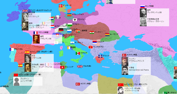 当時のヨーロッパはというと、現代に繋がる主要な国々が出てきています。フランス、スペイン、ポルトガル、ロシア、イタリアなどがありますね。この時代に存在したオスマン帝国は1900年代初頭まで存在していたようです。
