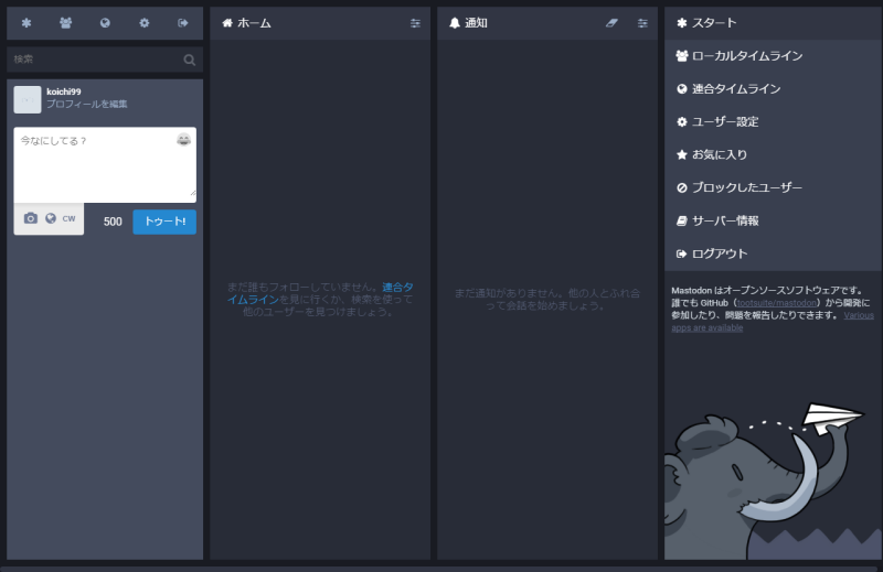 基本的な使い方はTwitterと同じなので難しい事はないと思います。ホームに表示されるのはフォローしている人たちだけですが、ローカルタイムラインでは、同一サーバー上のメンバーの発言が全部表示されます。さらに、連合タイムラインでは、リモートサーバー上での発言も含めて表示されます。