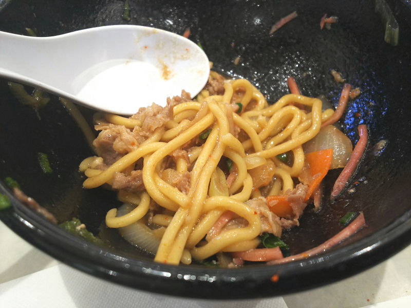 半分まで食べてみたところ。味付けは、牛丼そのものですが、ちゃんぽん麺と混ぜ込むと、これも悪くないなという気もします。ただ、牛肉は混ぜ込みやすくはないので食べやすくはないですね。