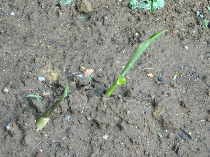 まずは茗荷。昨年まで植えてたものを掘り出して、肥料を入れ直してから埋め戻していたものです。本来なら、もう少し成長しているはずですが、やっと芽がでたくらいのところです。
