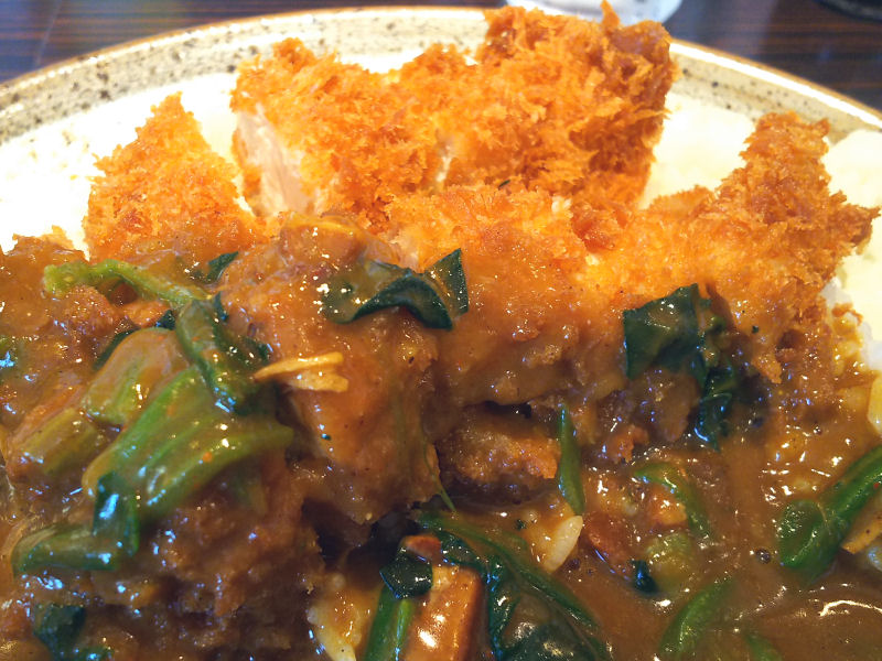 という事で、ささみカツカレーです。ほうれん草もトッピングで追加。今回も一辛にしました。ご飯は普通サイズです。