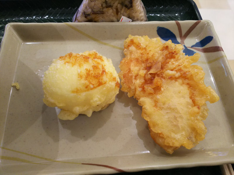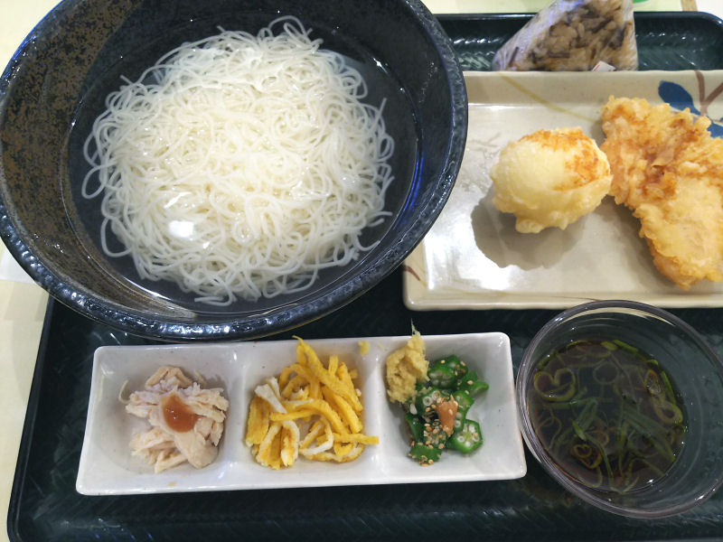 という事で、うどん県のそうめん。とり店、たまご天に梅昆布おにぎりも付けました。