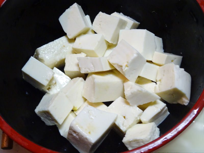 豆腐は、木綿豆腐でも絹ごし豆腐でもOK。今回は、木綿豆腐で作ってます。湯通ししておいた方がいいんですが、面倒なので省略。