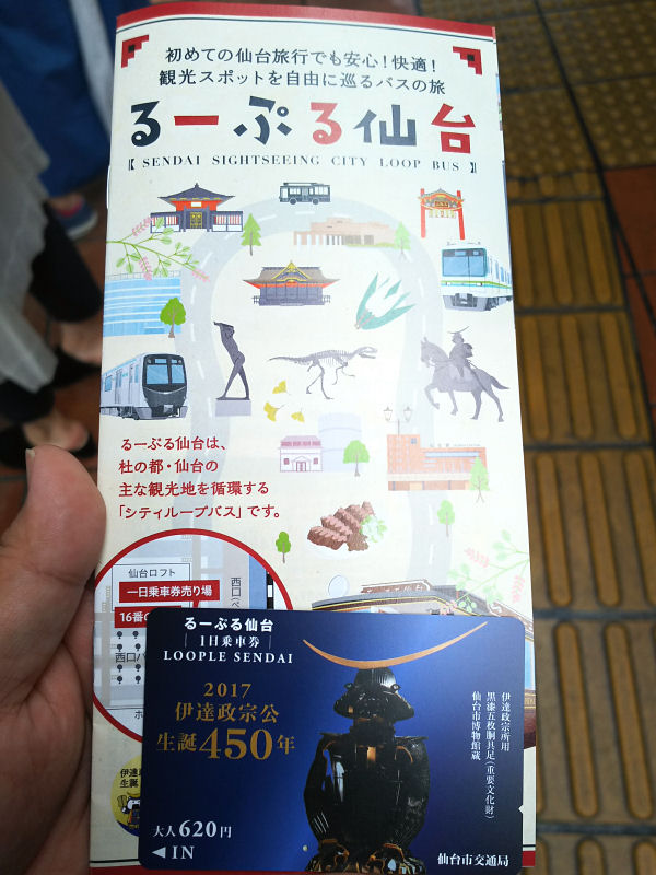 仙台駅バスターミナルより、仙台市内の観光名所を巡るるーぷる仙台が出ています。手荷物をコインロッカーに預けようとしたら、空きがなくて手間取ったりした事もあって、少々スタートが遅れてしまいました。バスターミナルでるーぷる仙台の1日乗車券を購入して乗り込みました。