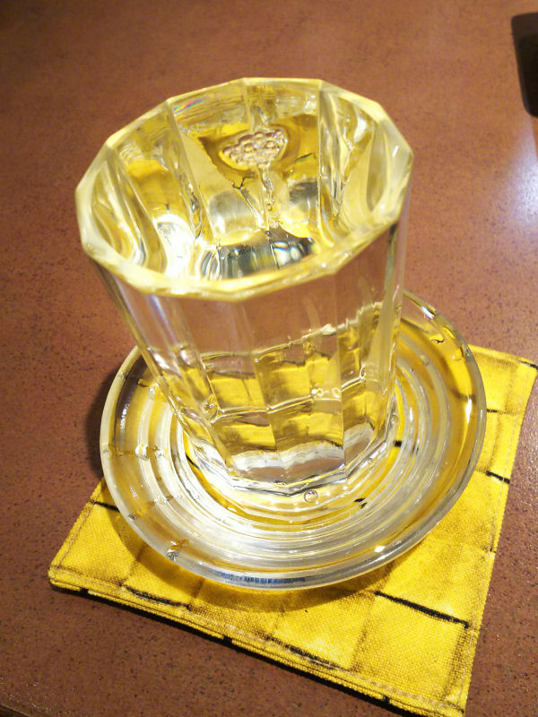 という事で、まずは一杯。お通しの奴は上に、イカの塩辛とクリームチーズがのっているものです。なかなか、美味しい。
