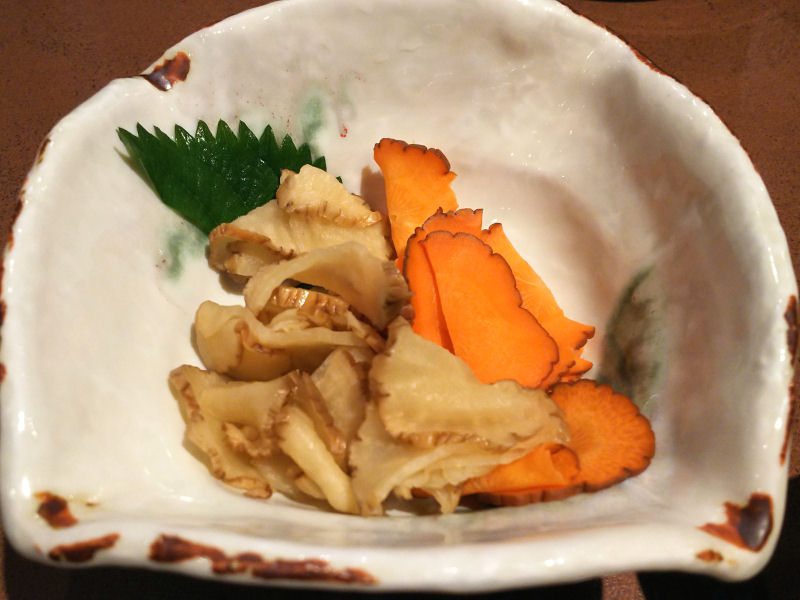 イカ漬けがなくなったので、追加で頼んだいぶりがっこ。これは、そこまで期待してなかったですけどいいですね。いぶした感じが、お酒にも合います。