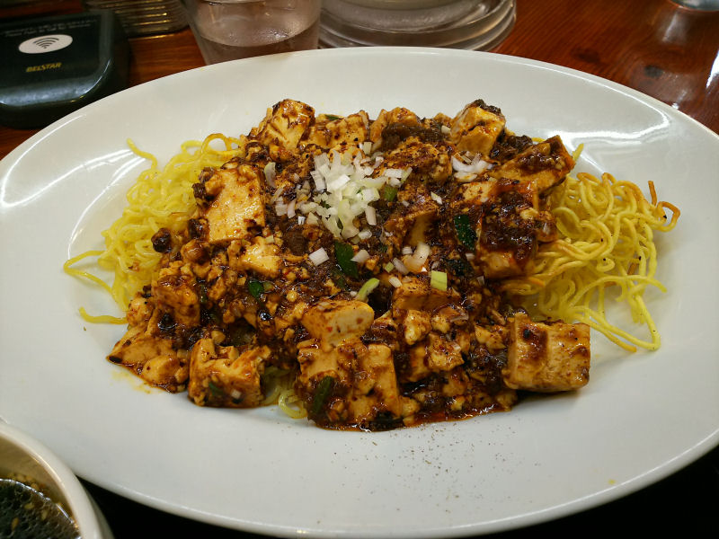 という事で、麻婆焼きそばです。麺は両面をしっかりと焼いたタイプでパリパリ。中はしっとりというタイプの焼きそばです。のっている麻婆豆腐はかなり本格的。これ結構辛いやつです。