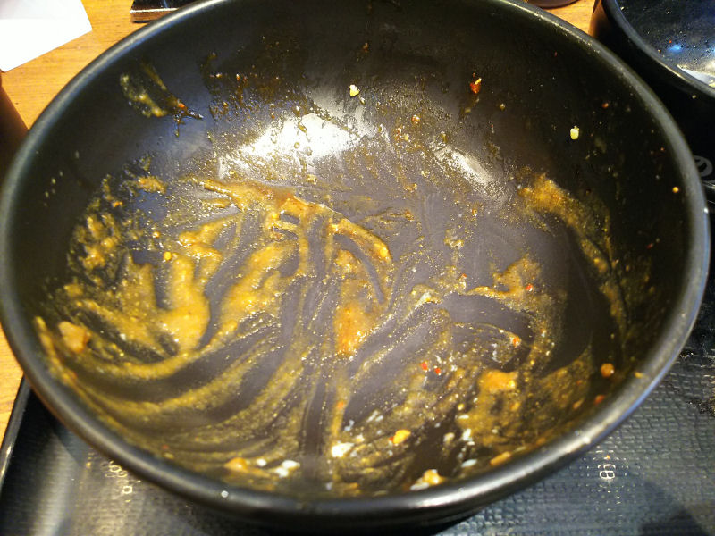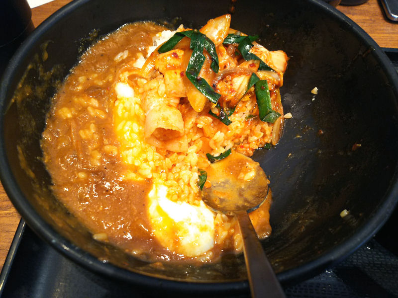 半分まで食べ進めてみました。豚キムチとカレーってどうなのよというのはありましたが、思いのほか違和感はありませんでした。すた丼屋のカレーは、割と何にでも合わせやすい感じがします。具材が溶け込んでいるタイプなので、肉といっしょにも食べやすいのです。