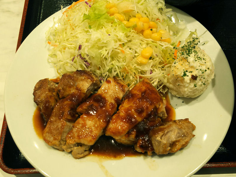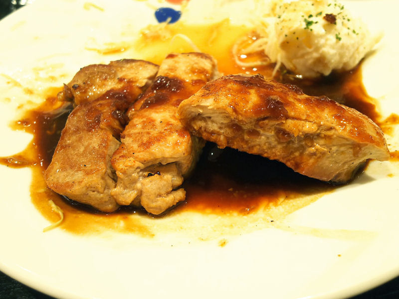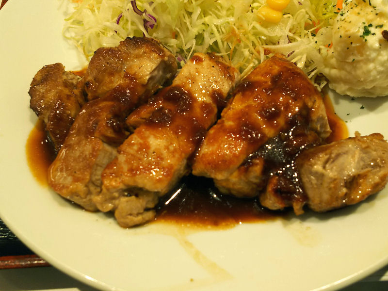 厚切り豚テキは、にんにくダレで食欲をそそる味付けになっています。厚めに切っている肉ですが、筋張ったところもなく非常に食べやすい。