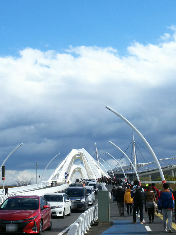 混雑していたので少し長く感じましたが、なんとか豊田市駅へ到着。そこからまっすぐ歩いて豊田大橋が見えてきます。その先に見えるのが豊田スタジアムになります。かなり大きいので近く見えますが、歩くと結構な距離でした。