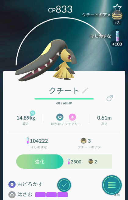 クチートは前から見るとかわいいけど、後ろから見ると怖い。