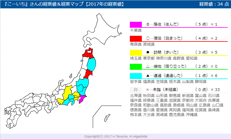 2015年の経県値を出してみました。2015年は新たに宿泊地になった県が増えました。