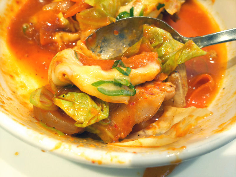 チキンは、こんな感じの大きさです。スプーンでまるごと取ると大きいくらいゴロッとしたサイズになっています。ダッカルビのタレは混ぜ込んでないので、食べる前に混ぜておいた方が味にムラがなくてよさそうです。