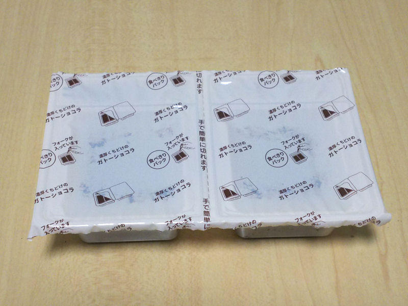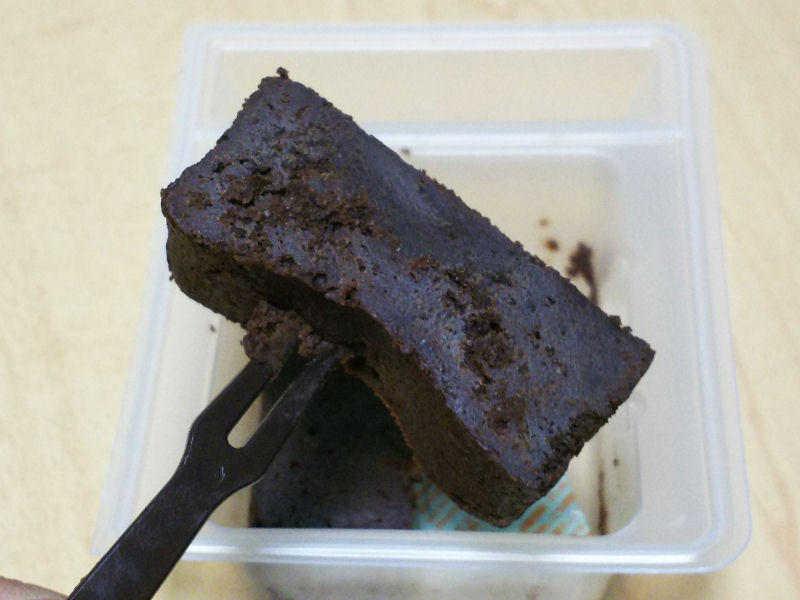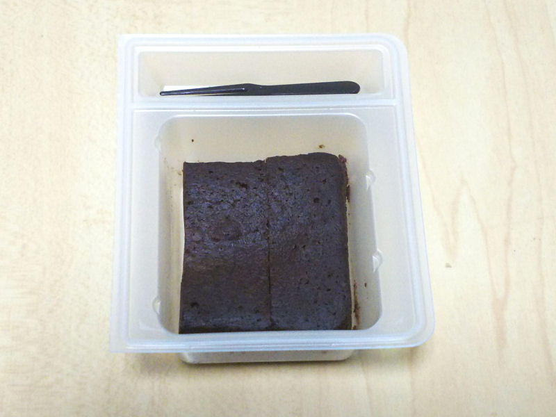 個包装をあけるとガトーショコラが2個入っています。フォーク入りです。大きさは小さいですが、わりとちゃんとしたガトーショコラになっています。