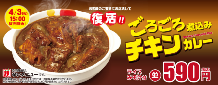 日曜日(4/8)は、松屋で復活の限定メニュー「ごろごろ煮込みチキンカレー」食べてきました。